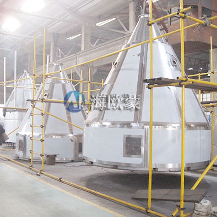 離心噴霧干燥機干燥室的形狀、大小與霧化器的形式、空氣分布器、尾氣排出管、排粉方式有關,取決于乳品的性質和對制品的要求。乳品干燥中主要用:垂直下降并流型。這種形式的的熱和氣流和液滴相接處,雖然氣流溫度高,其熱量都供給水分蒸發,實際液滴表面溫度接近濕球溫度,故仍能保持物料原有的特性。