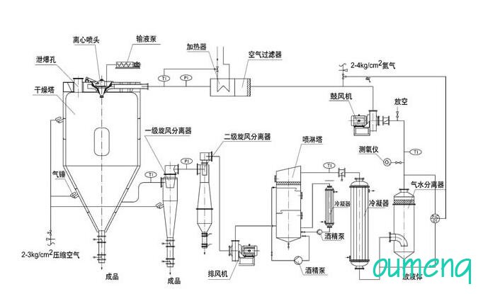 設備主要由:送料系統、加熱系統、霧化系統、噴霧干燥系統、惰性氣體循環系統、產品回收系統、冷凝系統組成。